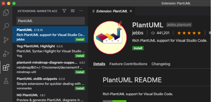 Extensions 메뉴 선택 후 ‘PlantUML’ 검색 및 설치