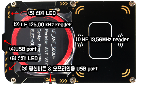 - 프록스마크 보드와 LF, HF 안테나 및 RFID 태그 등이 포함되어 있습니다.