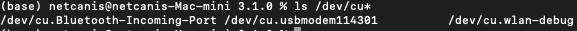 이후 조회하면 아래와 같이 ‘/dev/cu.usbmodem146224101’라는 장치가 추가 됬음을 알 수 있다.