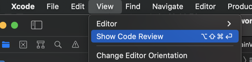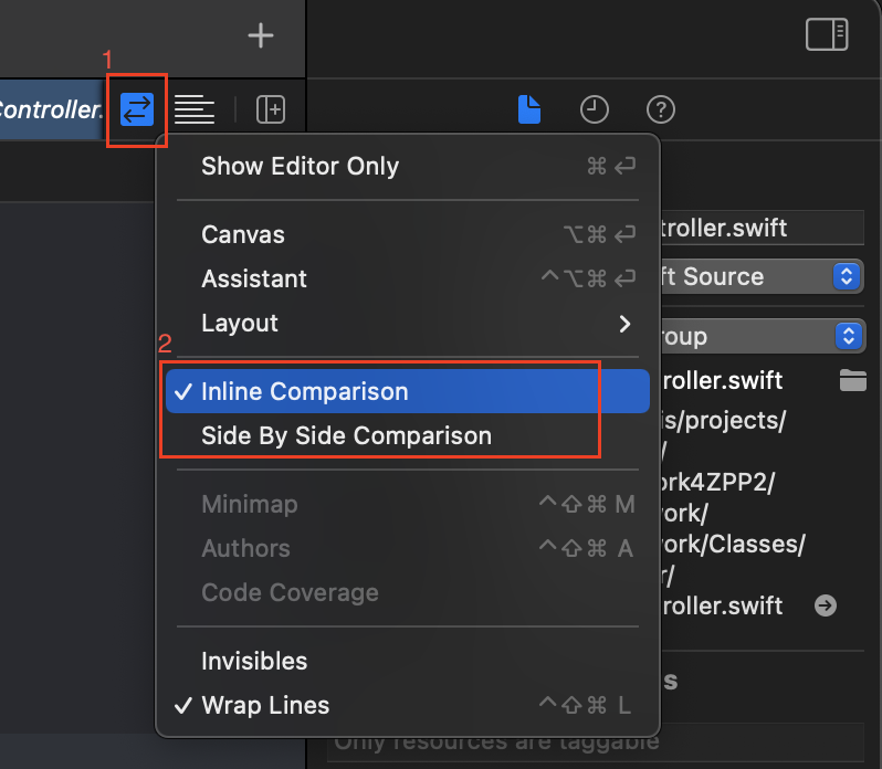 'Code Review' 가 활성화되면 Xcode 우상단 아이콘(1번)이 아래 그림과 같이 변경된다.