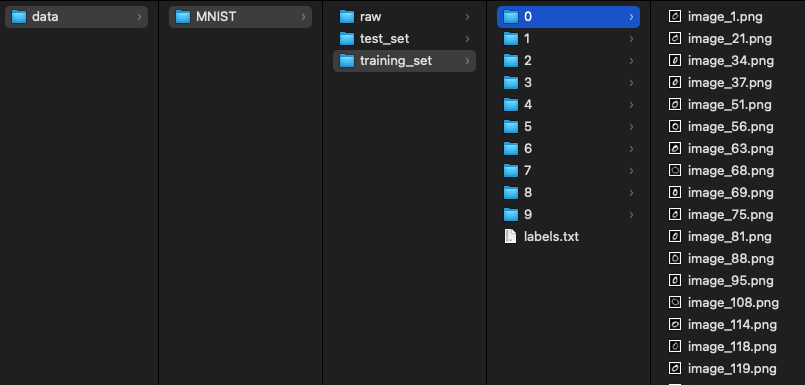 data/MNIST/row/ 폴더에 다운로드된 데이터셋 정보를 이용하여 image파일로 복원하고 해당 숫자(0-9)별로 폴더를 생성하고 각 숫자에 맞게 폴더내에 저장하도록 구현해 보았다.