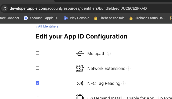 2. 해당 앱의 App ID 설정에 'NFC Tage Reading'이 체크되어있는지 확인한다.