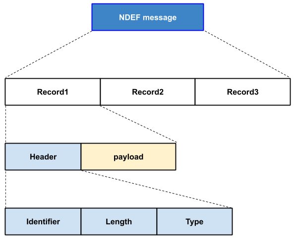 NDEF 메시지는 하나 이상의 NDEF 레코드로 구성된다. NDEF 메시지가 인캡슐할 수 있는 레코드의 갯수는 애플리케이션과 태그 타입에 따라 다르다. NDEF 레코드는 "Header"와 "PayLoad"로 구성된다 아래 그림은 NDEF의 메시지 구성이다.